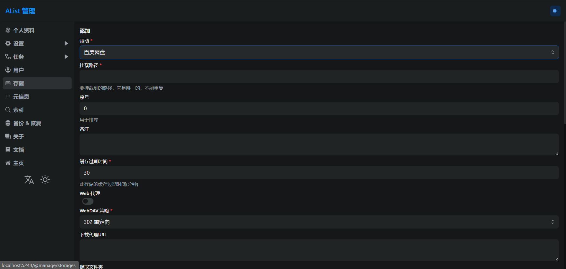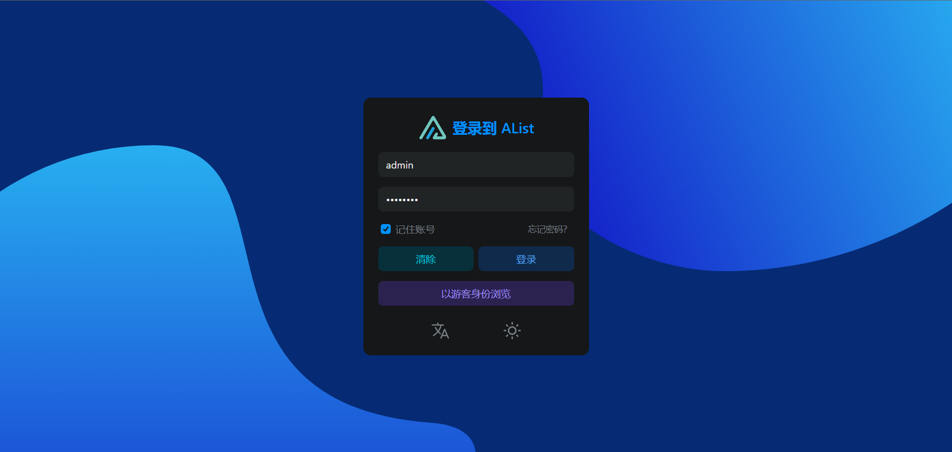 docker exec -it alist ./alist admin set NEW_PASSWORD记住上述生成的密码,登陆如下界面: