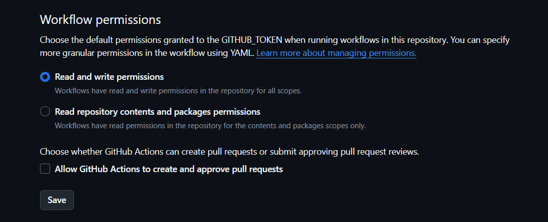 依次点击 settings-> actions-> general,调整 Workflow permissions 权限改为 Read and write permissions