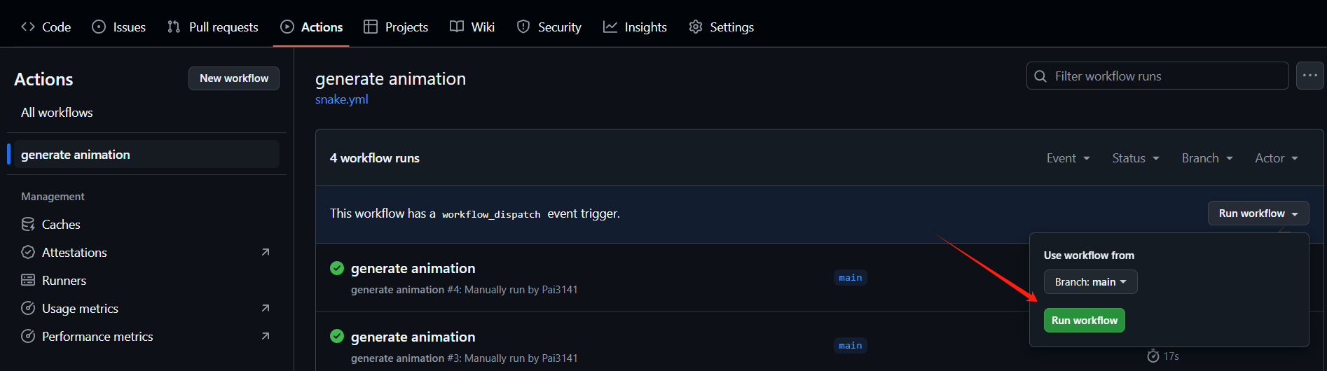 在ACTIONS中执行这个工作流(Run workflow)