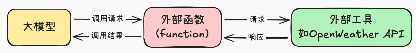 目前的通用处理策略使通过Function Call(Tool方法)方法实现对于特定API的访问,这里以调取某地区的天气状况的API为例: