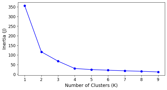 肘部法则(Elbow Method):绘制 K 与 J 的关系曲线,选择 J 下降趋于平缓的 K 值。